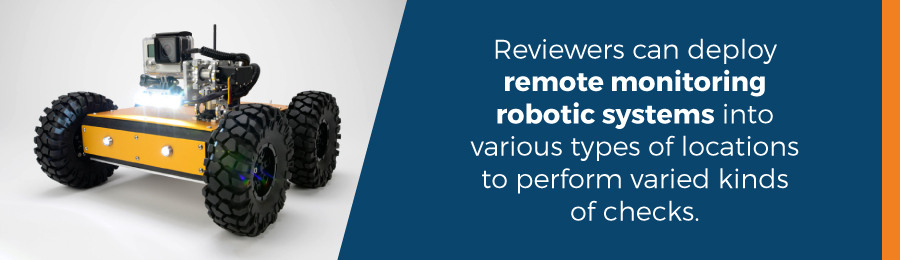 现代机器人技术使审查员能够完全远程进行检查。他们可以在各种地点部署远程监控机器人系统,执行各种检查。这些机器人可以进行不同程度的自主操作。工人可以远程控制它们,或者当工人在另一个地方检查收集的数据时,这些设备可能主要是自动运行的。