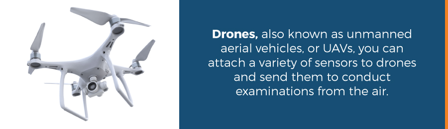 另一种可能更常见的用于执行检查的高科技工具是无人机。无人机也被称为无人驾驶飞行器,你可以在无人机上安装各种传感器,并让它们从空中进行检查。这种能力尤其适用于检查位于相当高的位置或分布在广阔区域的设备。无人机的大小各不相同,所以它们也能适应狭小的空间。