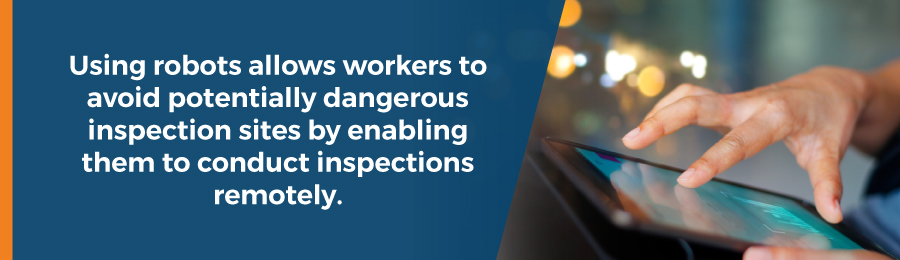 使用机器人使工人能够远程进行检查,从而避免潜在的危险检查地点。例如,工人们不用挂在电线上检查风力涡轮机,而是可以派无人机上去检查叶片。工人也可以避开重型制造设备、海上钻井平台的水下部件和其他潜在危险的地点。