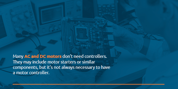 Many AC and DC motors don’t need controllers. They may include motor starters or similar components, but it’s not always necessary to have a motor controller. For example, you can adjust the speed of a brushed DC motor by varying the amount of volts traveling to the motor’s rotor and field. Brushless DC motors don’t have this capability because of a lack of a commutator, and they instead must rely on controllers.