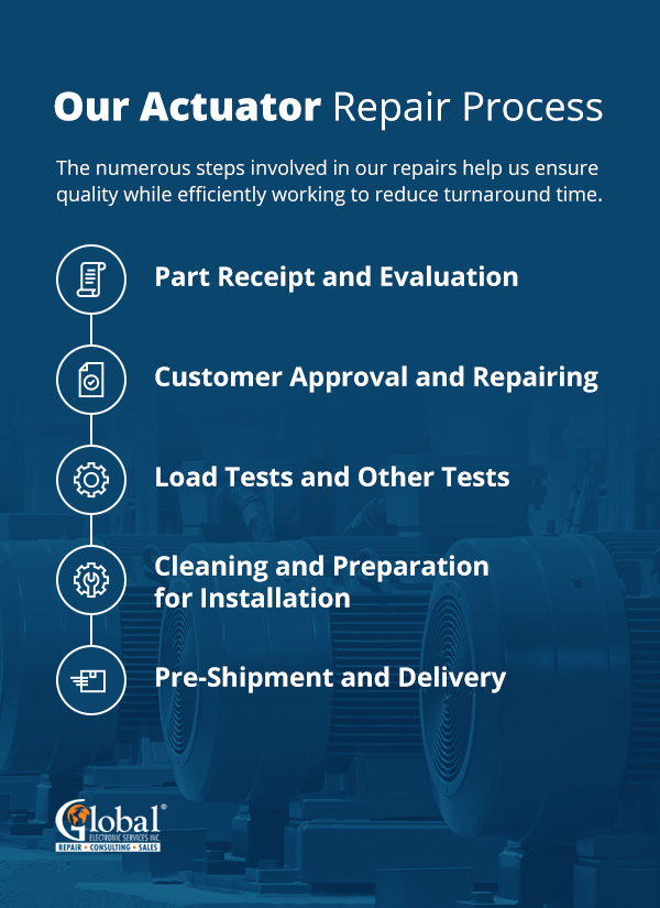 除了我们所做的维护任务外,我们还提供执行器维修。的我们的修理涉及许多步骤帮助我们确保质量,同时有效地减少周转时间。